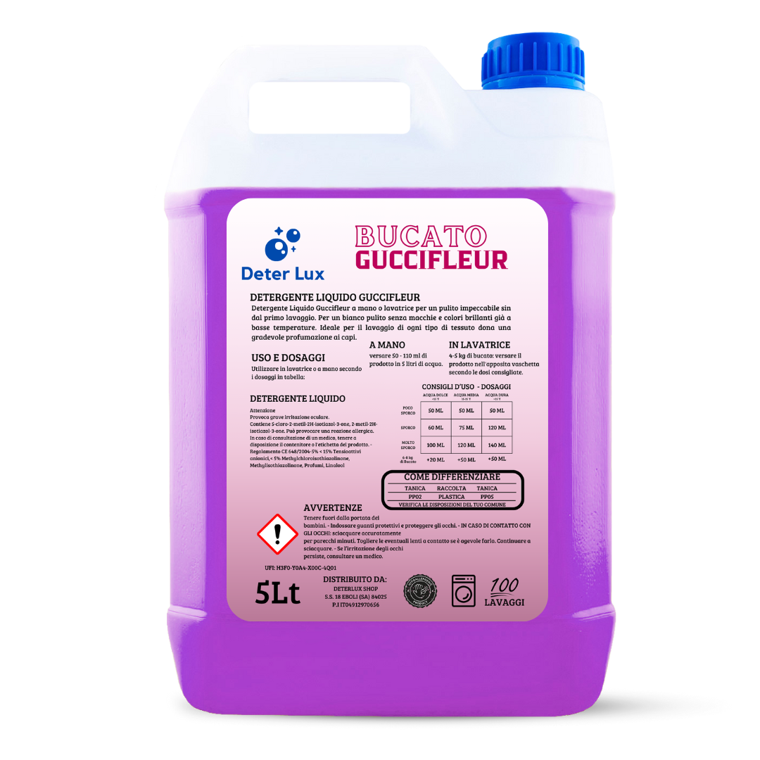 Il Detersivo Liquido Guccifleur di Deter Lux garantisce una pulizia impeccabile per il tuo bucato, lasciando sui capi una fragranza raffinata e persistente. La sua formula avanzata agisce efficacemente anche sulle macchie più difficili, rispettando le fibre dei tessuti e mantenendo la loro morbidezza naturale.