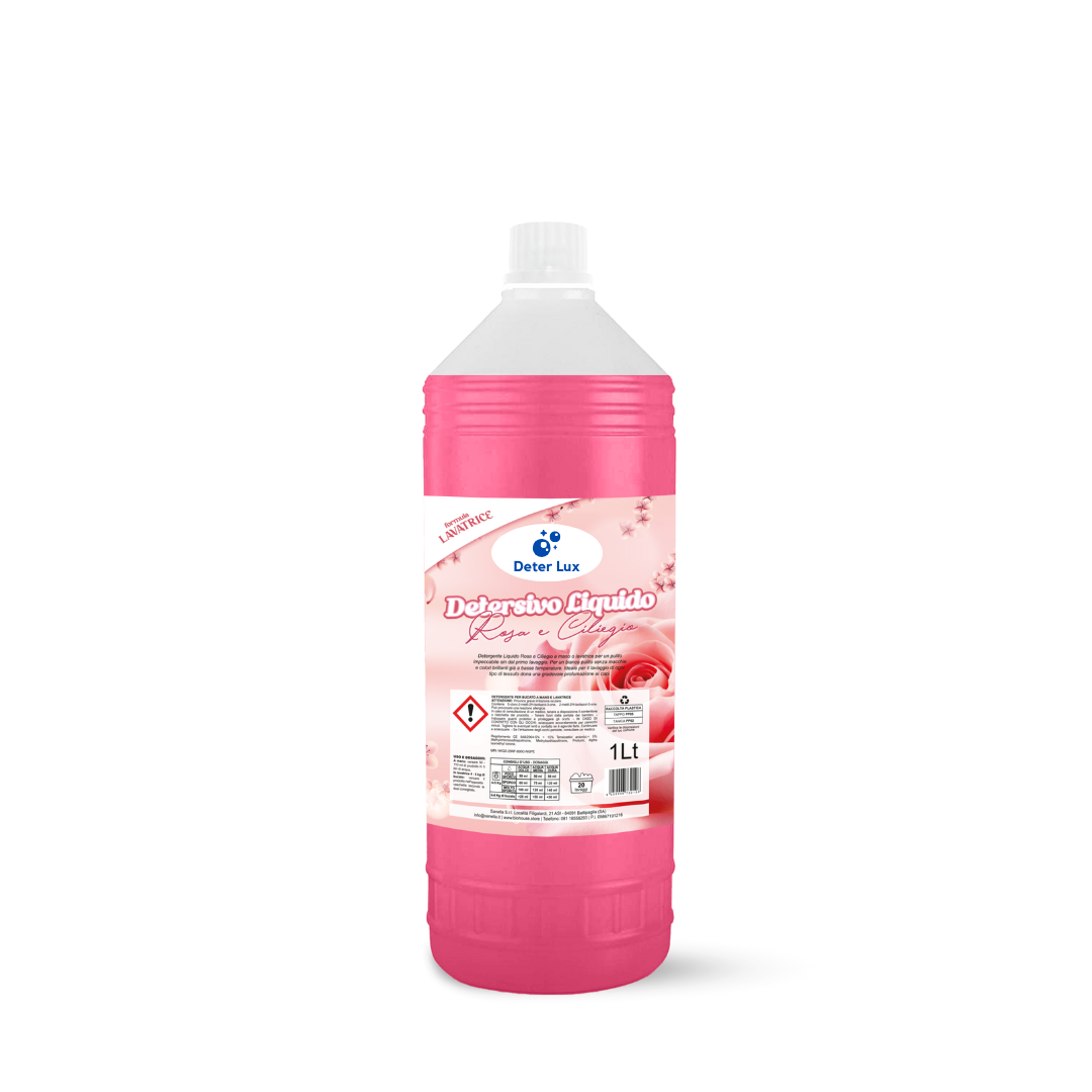 Il Detersivo Liquido Rosa e Ciliegio Deter Lux offre un pulito perfetto e una fragranza floreale delicata. La sua formula cura le fibre dei tessuti, lasciandoli soffici, freschi e profumati a lungo.