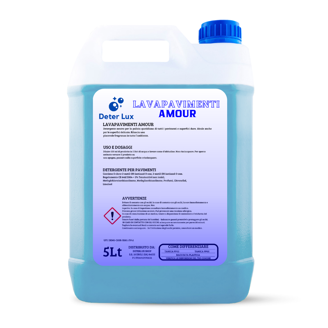Il Lava Pavimenti Mon Amour Deter Lux è un detergente neutro pensato per la pulizia quotidiana di tutti i pavimenti e superfici dure. La sua formula delicata lo rende ideale anche per superfici sensibili, lasciando un profumo fresco e avvolgente nell’ambiente. Perfetto per un uso domestico e professionale, rimuove efficacemente lo sporco senza lasciare aloni.